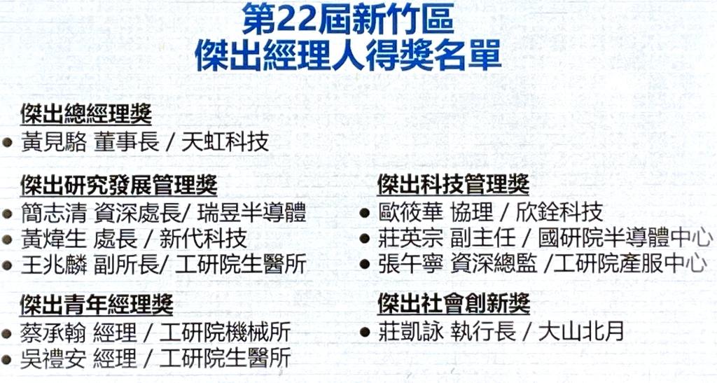▲第22屆新竹區傑出經理人得獎名單。(圖/新竹企經會提供)