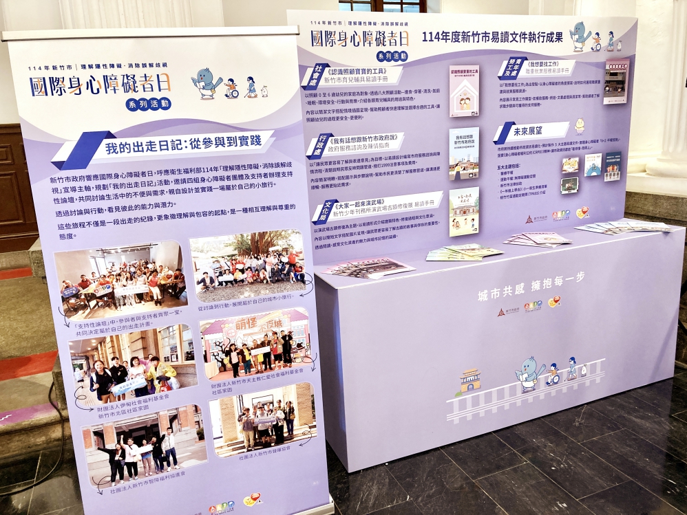 ▲新竹市國際身障者日系列活動開跑!新竹市政府特於今(11/28)日盛大舉行記者會,現場展示竹市府社會處、文化局、行政處、勞工及青年處製作4大主題易讀文件,實踐身心障礙者權利公約平等參與精神。