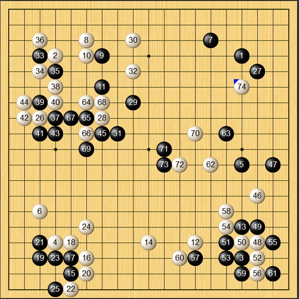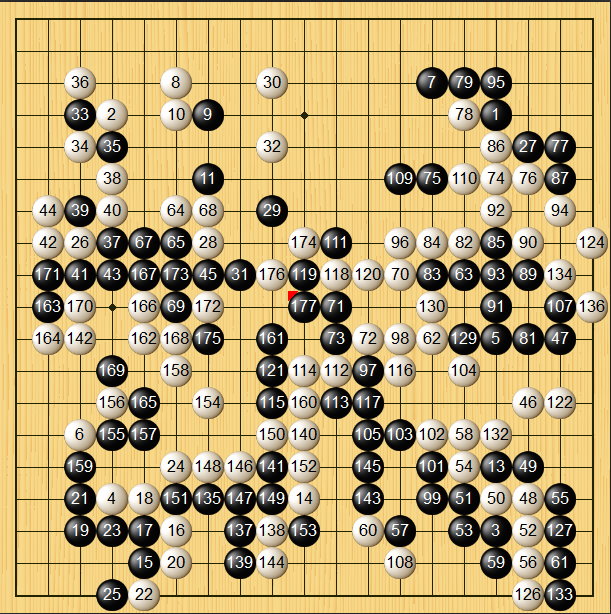 其後白棋雖在74成功打入右邊,由於黑棋的中國流陣地堅固,黑棋第111手敲響白棋的喪鐘,黑177手終於逼迫白棋棄子投降。(黑棋中押勝)