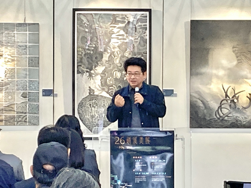 ▲「第26屆磺溪美展」巡迴展即日起至12月28日在竹美館美學堂及藝海閣盛大展出。竹美館長葉于正於開幕式致詞。