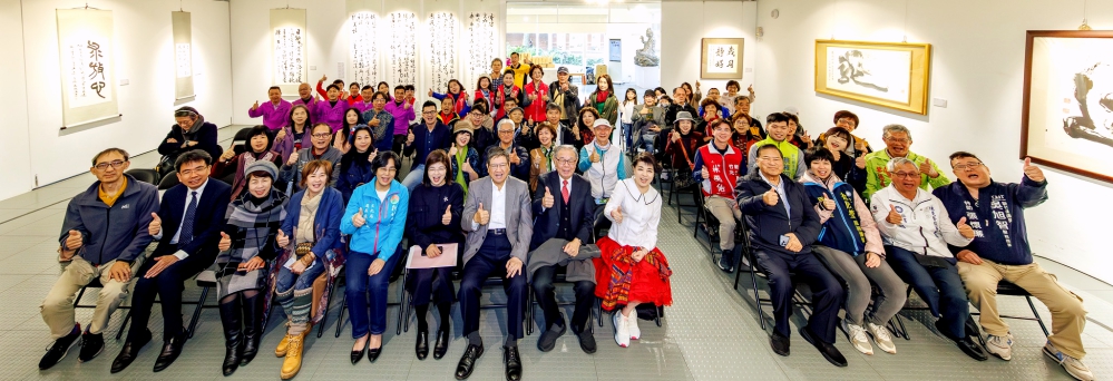 ▲書法名家-張炳煌教授「承古開新.筆墨共融」書法暨e筆作品展開幕活動,書法名家張炳煌教授(前排左8)、聲樂家簡文秀教授(前排左9)、竹縣長楊文科(前排左7)、竹縣府秘書長李安妤(前排左6)、竹縣文化局長朱淑敏(前排左5)和與會貴賓及全體人員一同合影。(圖/億光文化基金會提供)