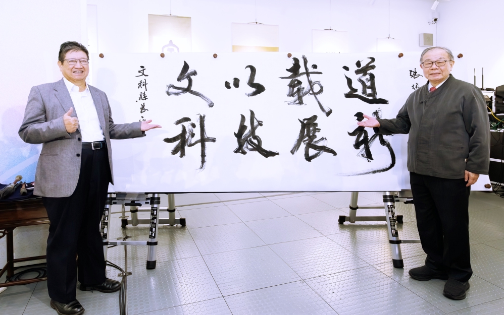 ▲張炳煌教授特別揮毫「文以載道.科技展新」八字送給東道主新竹縣長楊文科,讓現場觀眾大飽眼福看到大師出手揮毫筆力的磅礡氣勢。(圖/億光文化基金會提供)