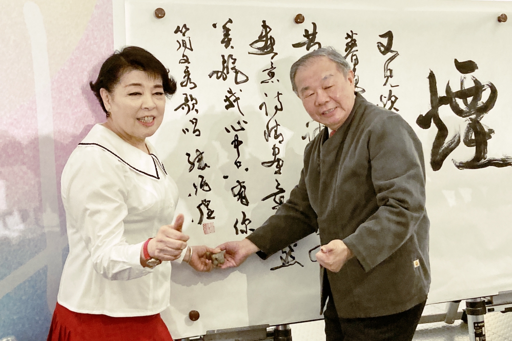▲聲樂家簡文秀教授美聲高歌一曲〈又見炊煙〉,張炳煌教授即於當場隨著簡教授歌聲,立馬筆墨揮毫歌名,兩位藝術家一同落款按讚,並為這次跨域藝術聯動創新的饗宴留下成功完美的印記!