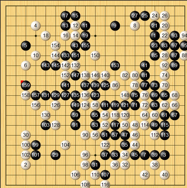 最後,再黑棋159手讓白棋徹底崩潰,白棋闖棄子投降。(黑棋中押勝)