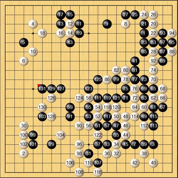 期間,白方棄守右上角,意圖在中間突破,但白方小看黑方決心,黑棋127、129、131展現棄子決心,白棋貪圖左下4子,陷入黑棋的陷阱不可自拔。
