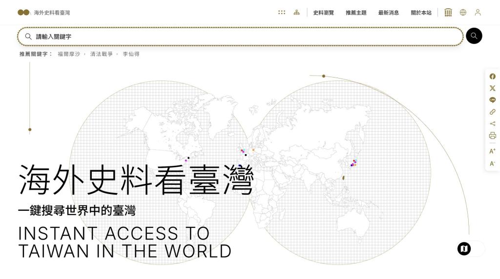 資料庫第一階段已開放20項研究計畫、18冊專書出版內容,及高達700件文物和文獻影像;無須註冊帳號,只要搜尋人物、地名或事件等關鍵字,在家中就能免費瀏覽海外史料中臺灣紀錄;除了研究用途,這個資料庫對一般民眾也相當友善;只要輸入關鍵字,就有機會遇見一張老照片、一段外國人筆下文字,或一則海外留下臺灣故事,透過外國人視角,看見不同時代臺灣。