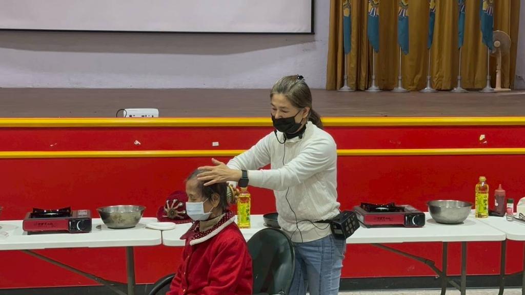 活動一開始,先由餐飲科李宜芳老師教導長輩運用梳子梳理頭髮,並搭配頭部按摩技巧,藉由溫和刺激頭皮,促進血液循環、供應毛囊養分,進而有助於預防落髮與促進生髮;過程中,同學細心陪伴、耐心引導,讓長輩在放鬆中感受被關懷與照顧溫度。