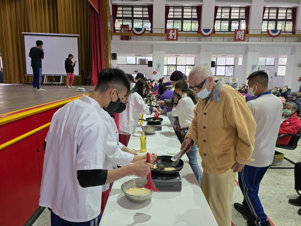 隨後,餐飲科同學貼心準備蓮子銀耳露、芝麻奶烙等點心,兼顧美味與營養,讓長輩在品嚐中感受年輕學子用心;活動現場亦安排同學獻唱歌曲助興,輕快旋律帶動氣氛,長輩們不時隨著節奏哼唱,笑聲此起彼落。