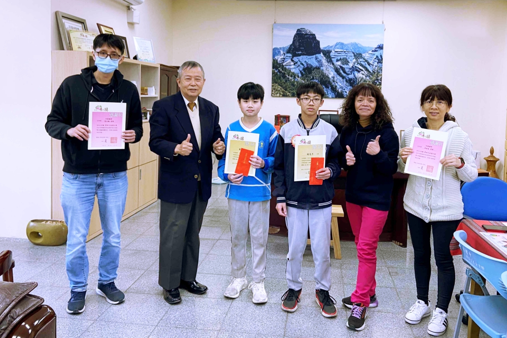 ▲普仁新竹區會長高傳鑑(左2)到竹東國中,在學校師長陪同下,頒獎給得獎小太陽賴旻彥(右3)、黃柄錡(左3)。(圖/靈鷲山佛教教團提供)