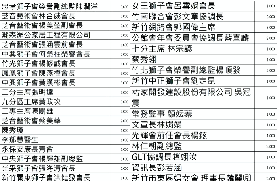 ▲新竹市芝音藝術獅子會八屆「芝音獅情」愛心音樂會捐贈贊助名單。(圖/芝音藝術獅子會提供)