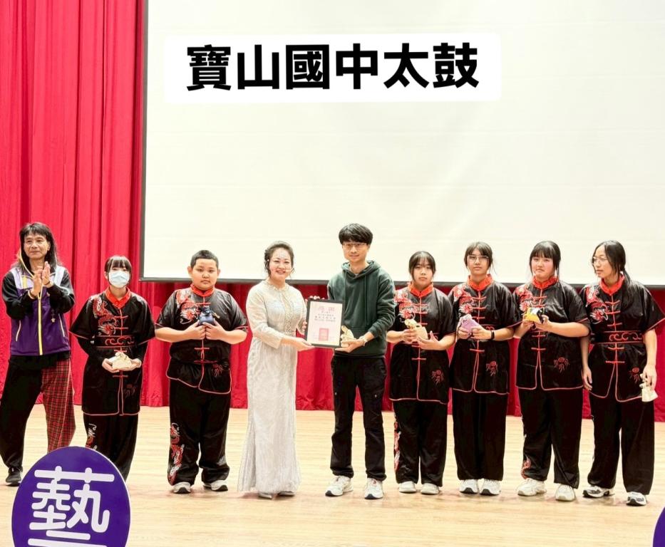 ▲芝音藝術獅子會創會長楊惠芝(左4)頒發感狀給寶山國中太鼓。(圖/芝音藝術獅子會提供)