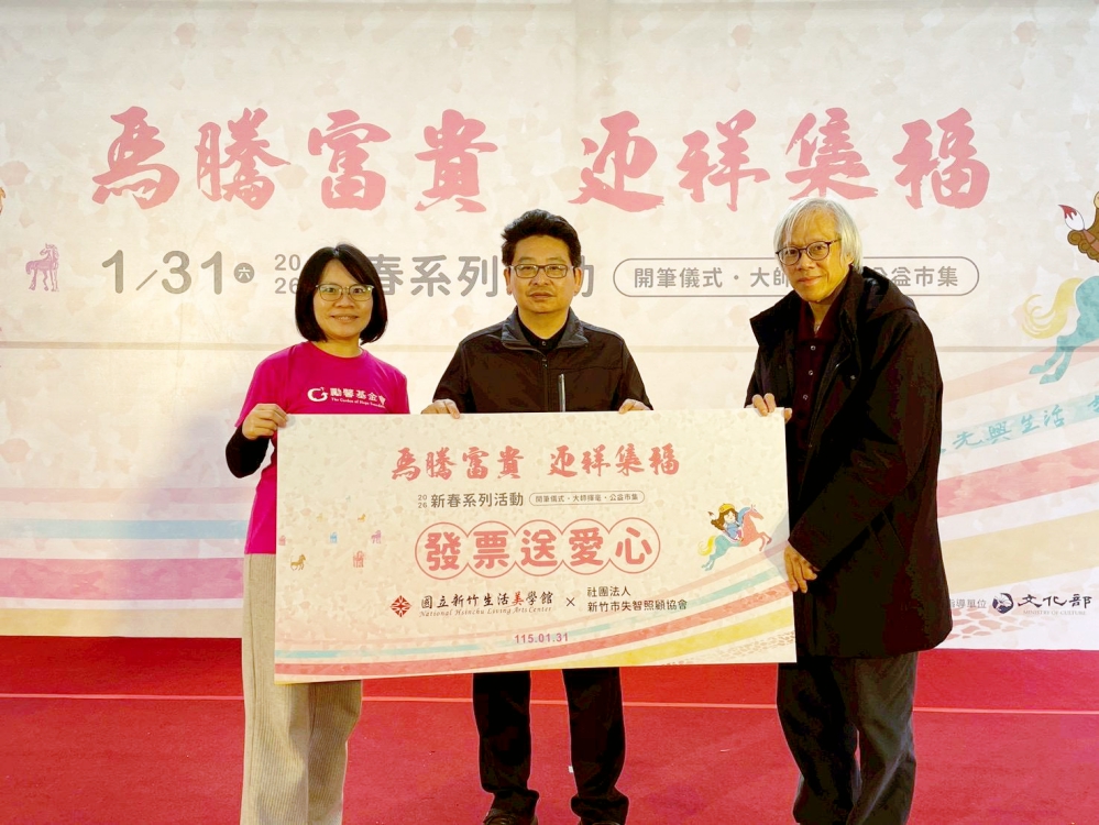 ▲竹美館2026「馬騰富貴.迎祥集福」新春揮毫活動熱鬧登場,這場活動並結合公益捐贈愛心發票,竹美館館長葉于正(中)代表捐贈愛心發票給社團法人新竹市失智照顧協會及勵馨基金會-新竹分事務所。(圖/竹美館提供)