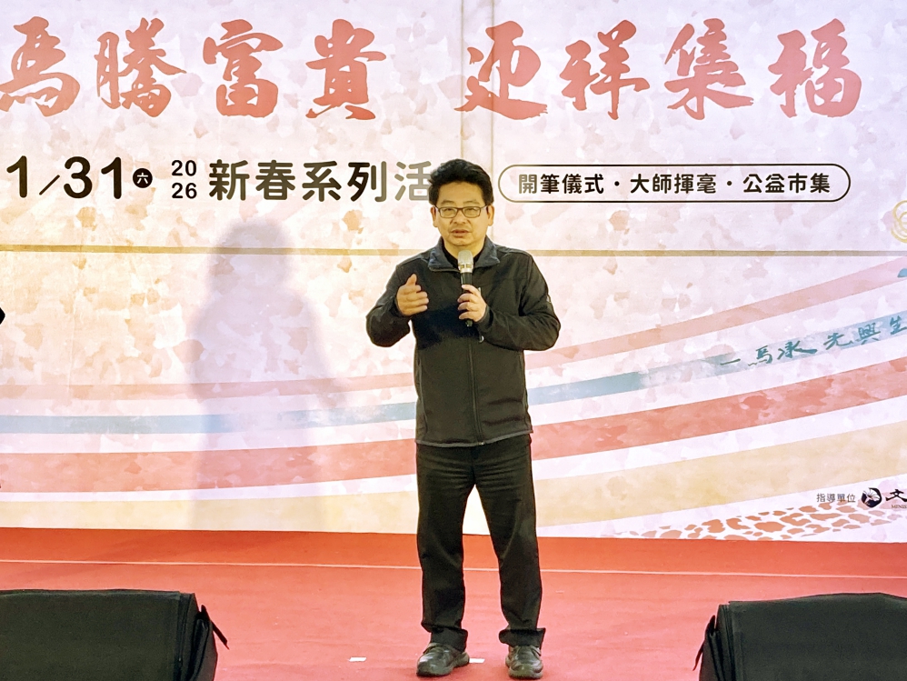 ▲竹美館2026「馬騰富貴.迎祥集福」新春揮毫活動熱鬧登場,竹美館館長葉于正致詞並逐一介紹現場重量級貴賓。(圖/竹美館提供)