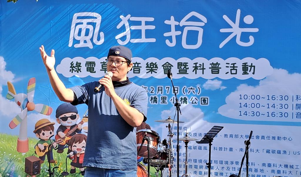 【大成報記者于郁金/臺南報導】南臺科技大學「藏碳蘊風」國科會科普計畫團隊於2月7日上午10時起在臺南市永康區東橋里小橋公園主辦「風狂拾光—綠電草地音樂會暨科普活動」;活動以風力與太陽能組成風光互補系統實際供應舞台音響用電,結合音樂展演與多元科普互動攤位,吸引眾多社區民眾與親子家庭參與,於社區公園中打造一場寓教於樂、貼近生活永續行動實踐。