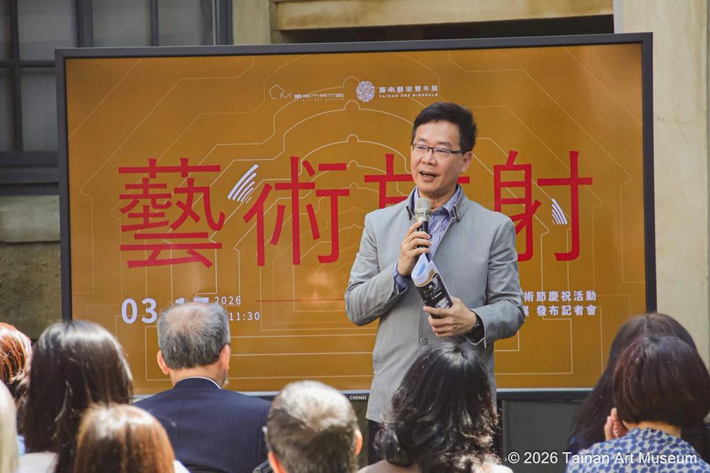 【大成報記者于郁金/臺南報導】臺南市美術館於近日舉辦「藝術放射」2026美術節慶祝活動及第1屆臺南藝術雙年展發布記者會,以圓環向外放射臺南城市意象,象徵藝術能量從中心向外擴散,在地各場館與藝文空間,吸引藝術家與觀眾齊聚一堂,展現藝術在府城活力與影響力。