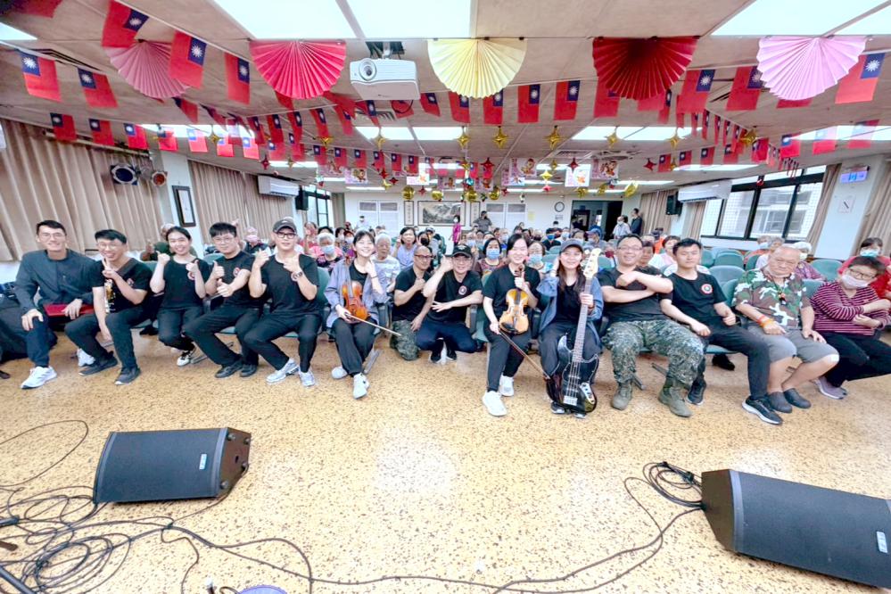 ▲八德榮家舉辦音樂饗宴,邀請國防部示範樂隊蒞家演出。八德榮家主任酆世俊(前排左)到場陪同觀賞,與長輩一同沉浸於溫暖樂聲中,現場氣氛溫馨熱絡,充滿歡笑與感動。(圖/八德榮家提供)