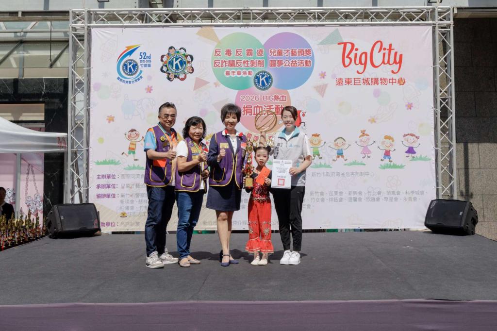 ▲國際同濟會台灣總會竹苗區在新竹巨城購物中心廣場舉辦同濟嘉年華活動暨兒童才藝園遊會公益活動,國際同濟會台灣總會竹苗區區主席廖龍珍(左3)、高虹安市長(右1)和才藝競賽表現優秀學生一同合影。(圖/市政府提供)