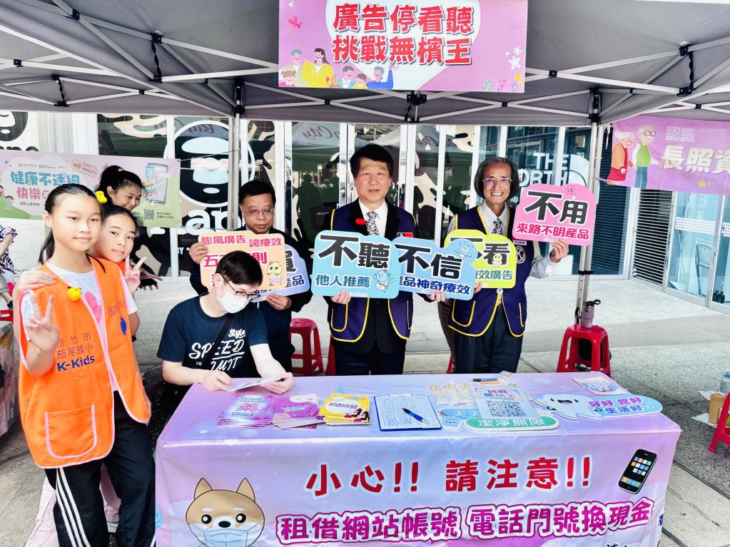 ▲國際同濟會台灣總會竹苗區在新竹巨城購物中心廣場舉辦同濟嘉年華活動暨兒童才藝園遊會公益活動,國際同濟會台灣總會總會長馮輝文(右2)前往竹市衛生局攤位一同宣導反毒、反詐騙。