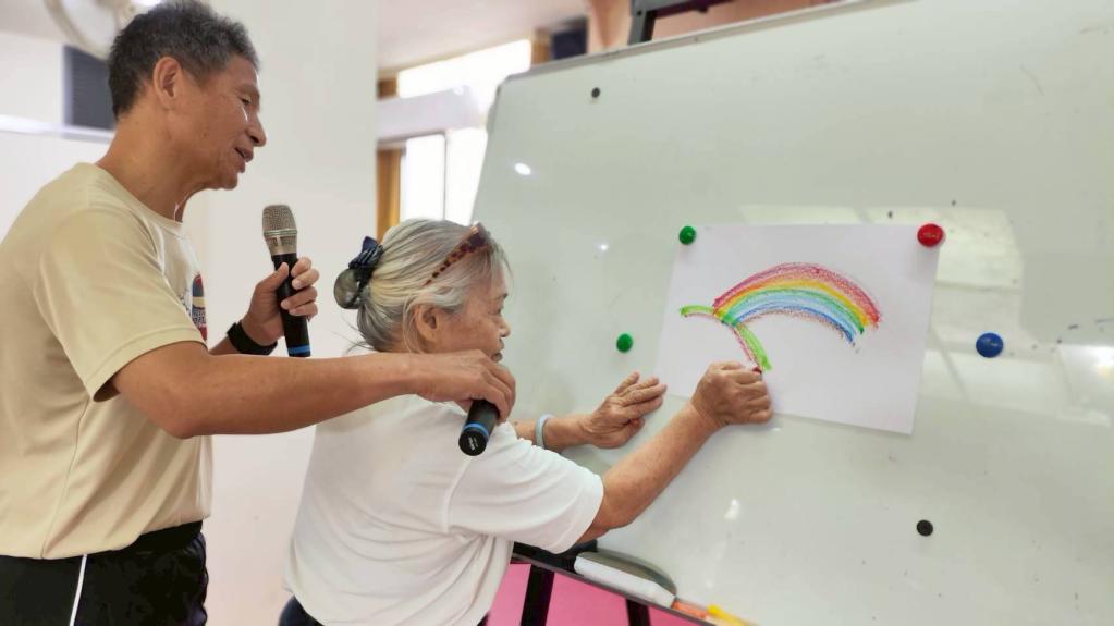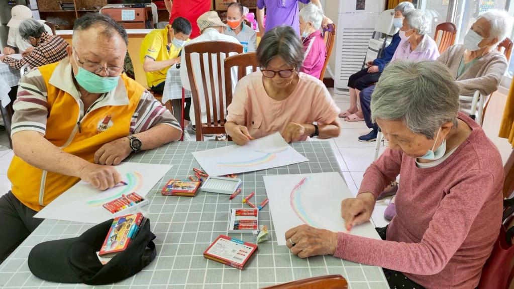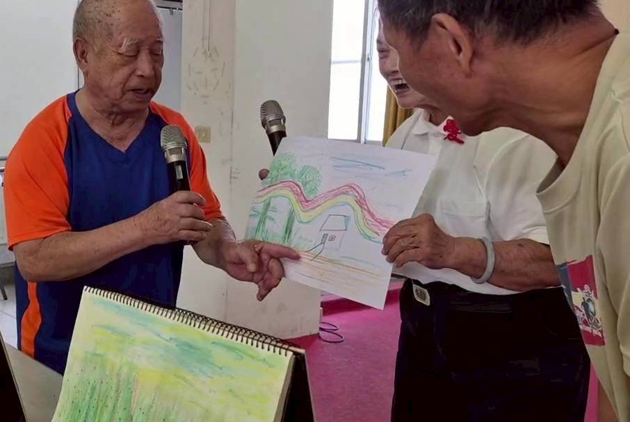 此次課程中,黃美玉現場示範「創意彩虹」畫作,引導長輩從顏色出發,延伸個人生命故事,多位長輩完成後踴躍上台分享,讓畫作承接生命記憶,流轉內在情感。
