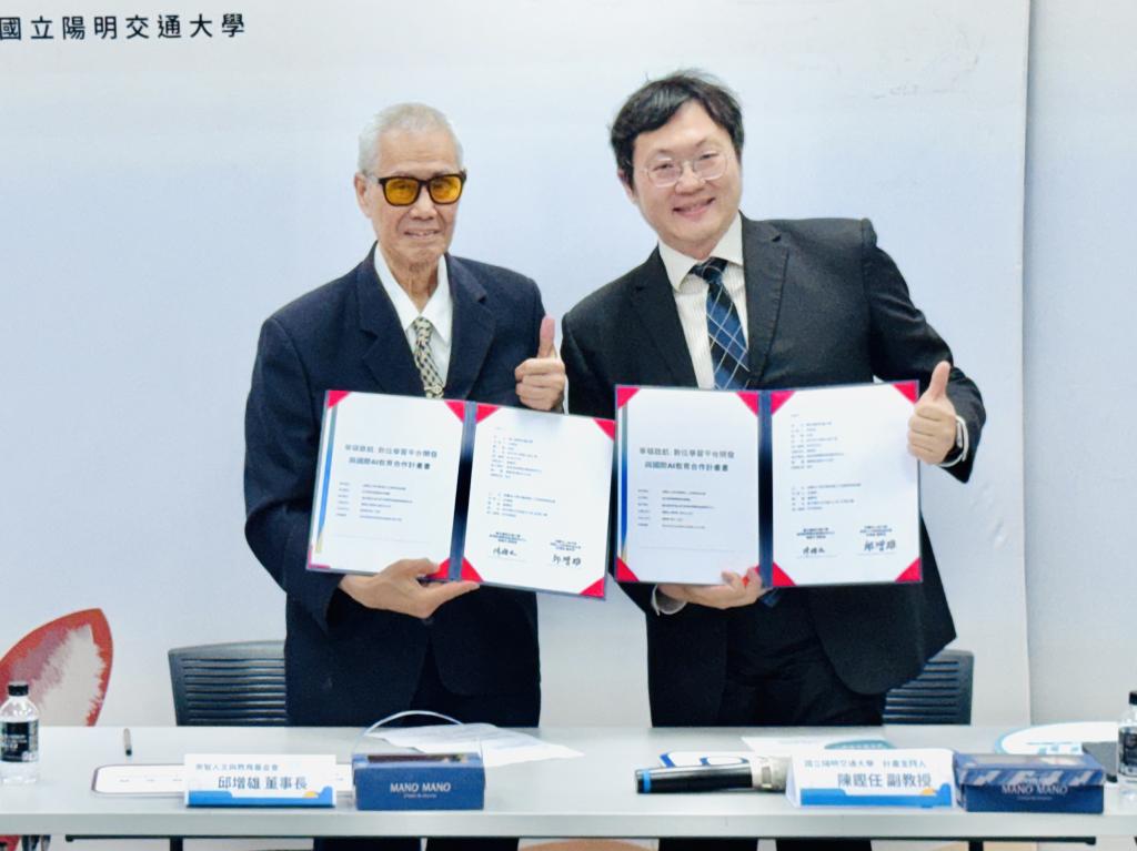 ▲國立陽明交通大學與崇智人文與教育基金會簽署產學合作備忘錄。崇智人文與教育基金會董事長邱增雄(左)、陽明交大 HERO 中心副主任陳鏗任(右)合影。