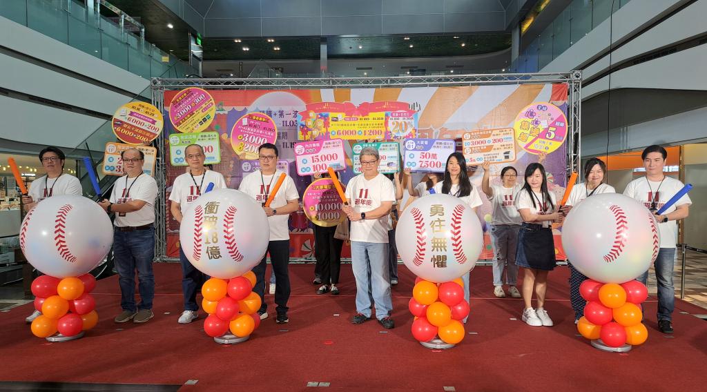 南紡購物中心副總經理楊鈵彥接續頒發2024年度業績最高品牌榮耀獎項,肯定合作夥伴表現,最後由總經理莊景堯率副總經理楊鈵彥、蔣宜宸、臺南紡織集團侯郁琳小姐等共同揮棒擊向象徵「衝破18億」巨型棒球,寓意業績再創高峰,為11週年慶揭開熱鬧序幕。