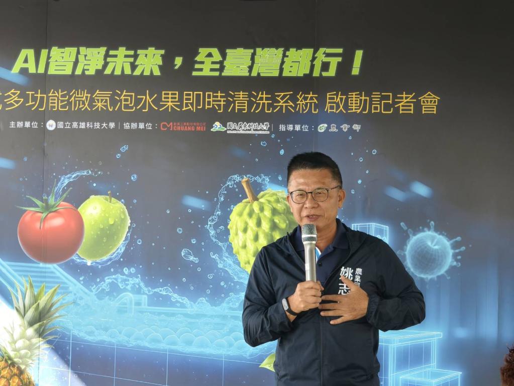 【大成報記者張淑慧/高雄報導】由農業部指導,國立高雄科技大學攜手創美工業股份有限公司共同研發的「貨櫃式多功能微氣泡水果即時清洗系統」今(22)日日正式亮相。這是全臺首套能直接駛入果園並現場啟動的行動化清洗設備,可在採收後 30 分鐘內完成清洗、乾燥、分級與包裝全流程,堪稱台灣水果後處理技術的一大突破。
