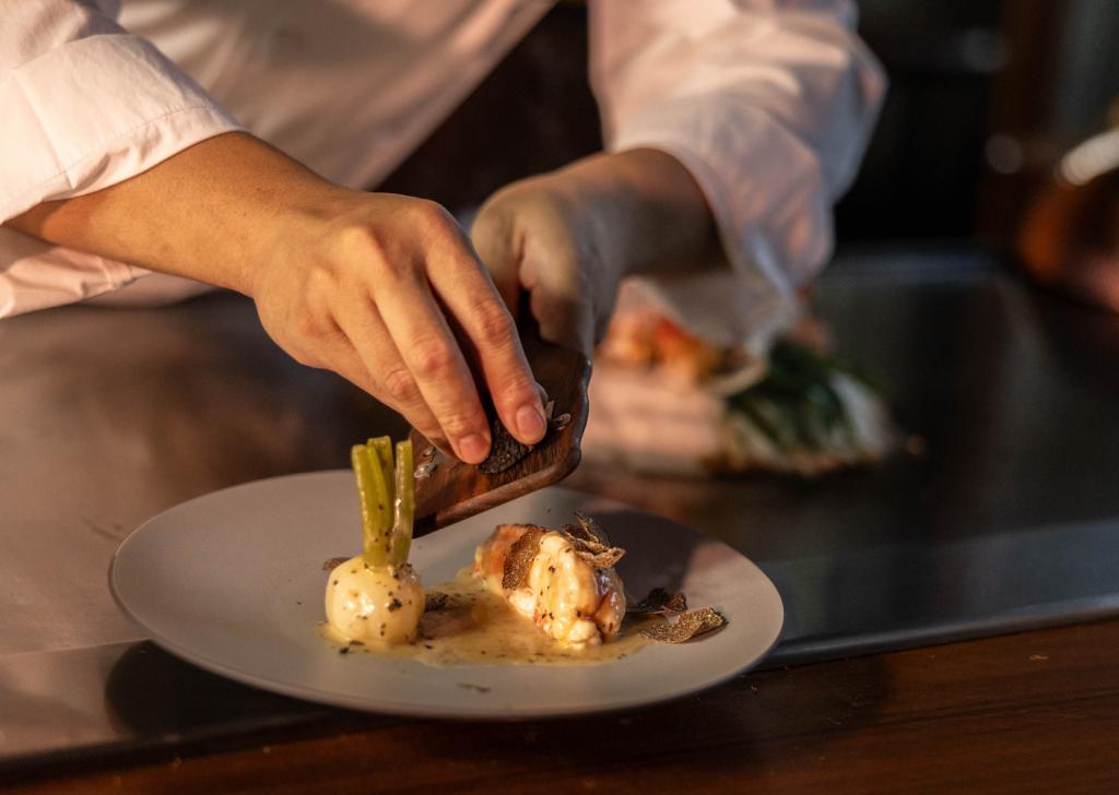 Ukai-tei鐵板燒以食材在冬季的最佳狀態為靈感,從低溫、燻香、快炒到高溫鐵板,展開一段以溫度遞進為核心的料理劇場。主廚特別推薦「煙燻烏骨雞 馬告 茄子」,是以65度低溫熟成烏骨雞,搭配烏龍茶葉煙燻所形成的柔和香氣,佐以帶森林氣息的馬告撒在燉煮茄子上,使第一口便能感受冬天的暖流。「蕪菁黑松露金湯」以雞湯為底,結合蕪菁、黑松露與人蔘、紅棗、枸杞等藥材,以虹吸壺萃取香氣,將冬日的靜謐化為一口溫潤金湯。「鱈場蟹 蕪菁 黑松露」則是以鹽蒸方式呈現鱈場蟹的鮮甜,搭配煮至綿密的蕪菁與黑松露奶油醬,鐵板上以蒜頭、紹興酒與松露碎快炒收味,再刨上新鮮黑松露,堆疊出冬季最奢華的一抹濃度。對追求高雄頂級鐵板燒、紀念日與節慶饗宴的饕客而言,此次的鐵板燒菜單是一場不容錯過的冬日演出。
