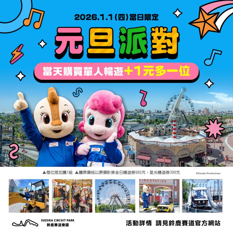 迎接2026年元旦,鈴鹿賽道樂園於1月1日推出「元旦派對」限定活動,祭出「購買暢遊方案,全日暢遊加1元多1位」優惠,為親子與年輕族群提供跨年出遊新選擇。