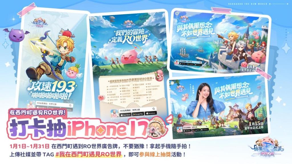 為慶祝《RO仙境傳說:世界之旅》正式上市,官方同步推出多項宣傳活動,線上線下全面展開。官方即日起至1月31日推出社群抽獎活動,玩家只要拍攝西門町任一《RO世界》廣告看板,並於社群平台打卡「#我在西門町遇見RO世界」,即可參加抽獎;同時,也宣布將於1月22日至2月21日攜手清原推出限定聯名飲品,共有三款專屬飲品限時販售,並搭配社群聯名抽獎活動,讓玩家邊喝飲料邊享受遊戲樂趣。