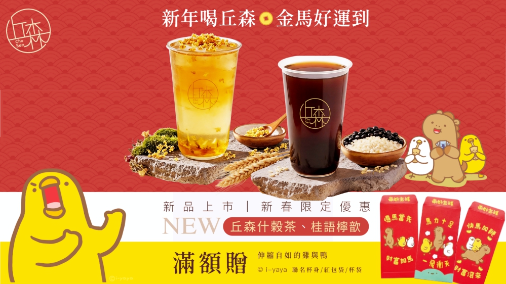 為提升新春活動的互動與趣味性,丘森茶室此次特別攜手人氣插畫家 【伸縮自如的雞與鴨】,推出聯名杯身、紅包袋與購物背帶等限定周邊。