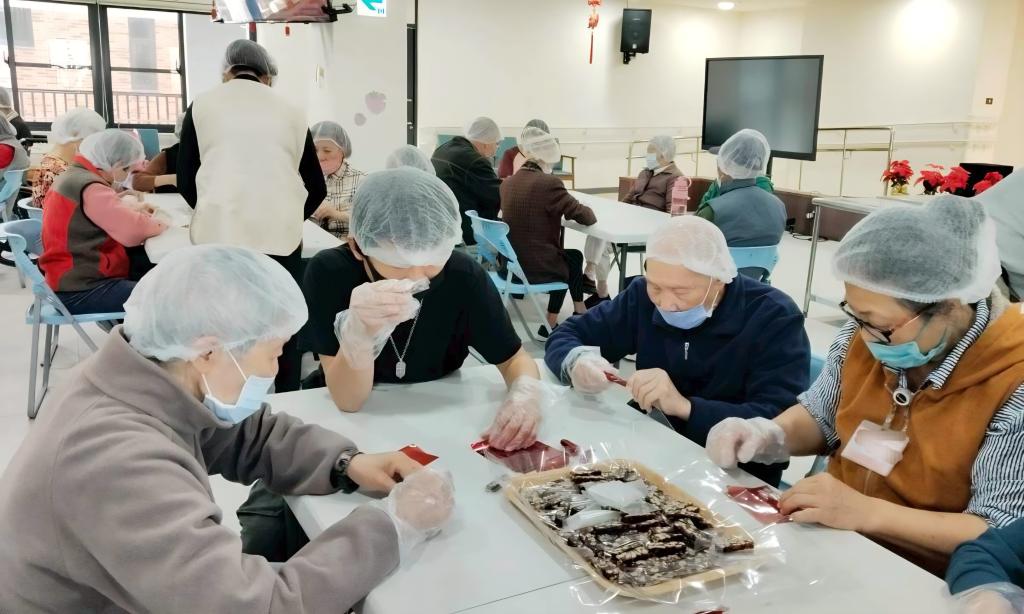 完成後,長輩化身「幸福使者」,親手將南棗核桃糕送到各個養護區,向其他住民獻上祝福,彼此道聲新年好;笑容與感謝聲此起彼落,讓家區充滿溫馨人情味。