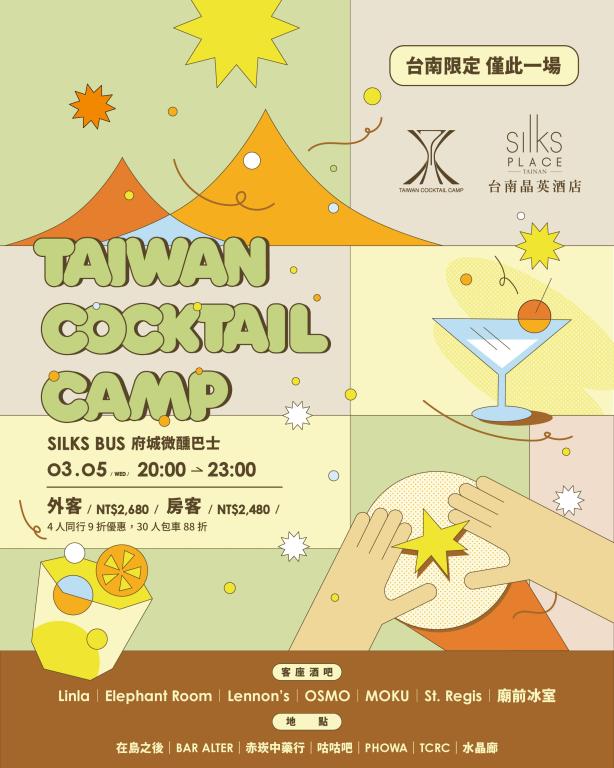 【大成報記者于郁金/臺南報導】全台首見、亞洲規模最大的國際調酒盛會「Taiwan Cocktail Camp 2026」將於3月4日至7日串連臺北、臺中、臺南、高雄4座城市同步引爆;作為府城款待指標台南晶英酒店也將於3月5日晚間加開「府城微醺巴士」限定班次,帶領愛酒饕客穿梭府城巷弄,喝遍7位亞洲頂尖調酒職人特製酒品,展開一場充滿驚喜大人味微醺壯遊,乘車每位2,680元,房客優惠價2,480元,4人同行還享9折優惠,詳情請上《晶好購》「https://silkslife.com/activity/」。