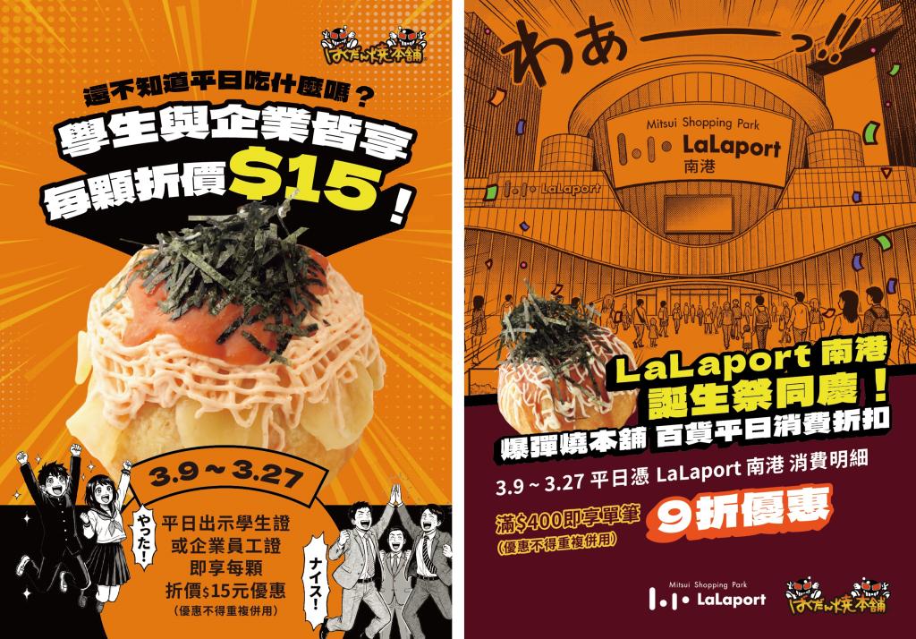 「爆彈燒本舖」為了讓更多消費者能輕鬆品嚐巨無霸章魚燒的魅力,特別推出平日限定優惠活動,民眾於自3月9日至3月27日期間,平日出示學生證或企業員工證,即可享每顆爆彈章魚燒折價15元優惠;另平日憑 Lalaport 南港館內消費明細,單筆滿400元亦可享爆彈章魚燒單筆9折優惠。