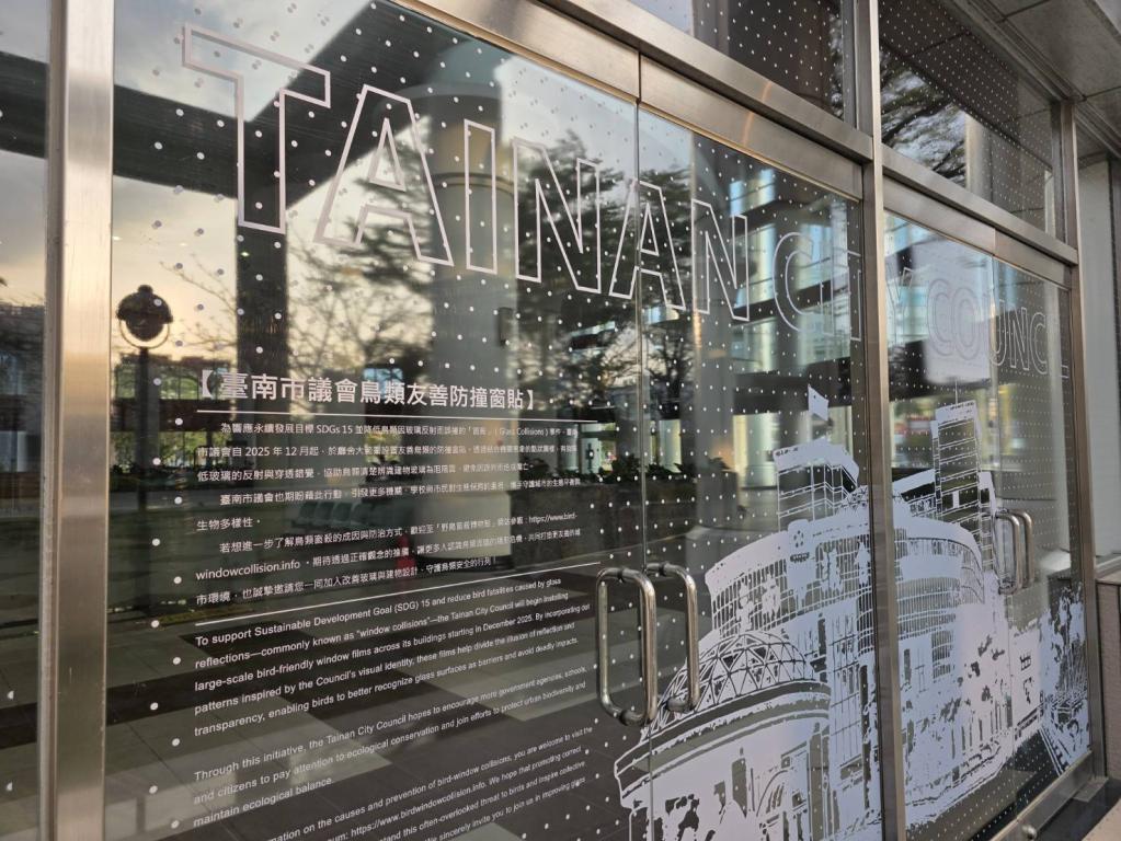 【大成報記者于郁金/臺南報導】為響應聯合國永續發展目標(SDGs)第15項「保育陸域生態」,並積極防範鳥類因誤判玻璃反射而發生「窗殺」(Glass Collisions)悲劇,臺南市議會近日於廳舍大範圍設置友善鳥類防撞窗貼,以實際行動為都市鳥類打造更安全飛行環境。