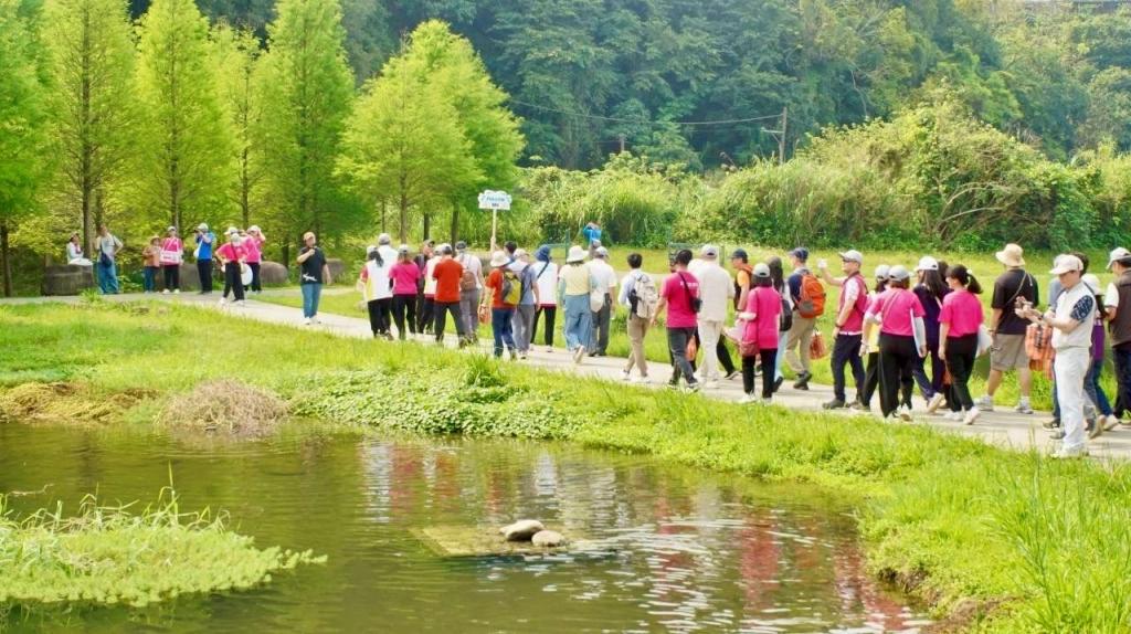 此次健走路線約2.4公里,鳴笛聲響起,張禹斌副署長偕同醫院醫療服務審查執行會北區分會翁順隆主委、北區醫院院長聯誼會、西醫、中醫、牙醫師公會及職業總工會理事長等貴賓,引領民眾向前行。沿途經大溪月眉溼地生態公園落羽松大道、山豬湖親水園區及中庄吊橋,並安排專人生態導覽,除風景優美之外,也讓民眾有更一步認識溼地多元生態,獲得民眾讚聲連連。