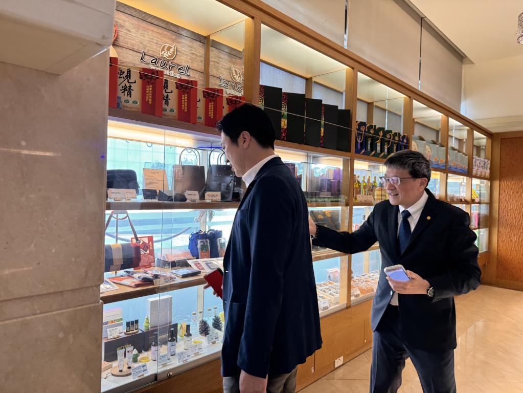 訪問團於台糖長榮酒店大廳參觀洪易大師鋼板烤漆藝術創作、宮崎和牛皮件展售;洪易老師創作藝品用色大膽明亮,並結合東方文化圖騰、民俗意象與生肖符號,作品隱喻祝福和吉祥話語受到參訪團高度讚揚;宮崎和牛皮件是結合日本職人技術與地方產業資源,展現宮崎縣在高附加價值產業上實力,如今能在酒店陳列與銷售,成為台日產業交流重要象徵。