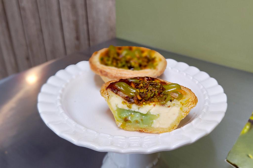 第一層為頂部灑上開心果脆粒,堅果香氣爆發與酥脆撻皮相呼應,層次豐富的酥脆感在口中交織,揭開感官的第一道序幕;第二層為於頂層覆蓋一層開心果慕斯,香氣清新、細緻綿密的口感平衡了流心的濃郁,賦予整體蛋撻更精緻的層次感;第三層為內層濃郁且溫潤的開心果流心內餡,絲綢般柔滑的質地伴隨細緻堅果香,在濃郁奶香中優雅綻放。