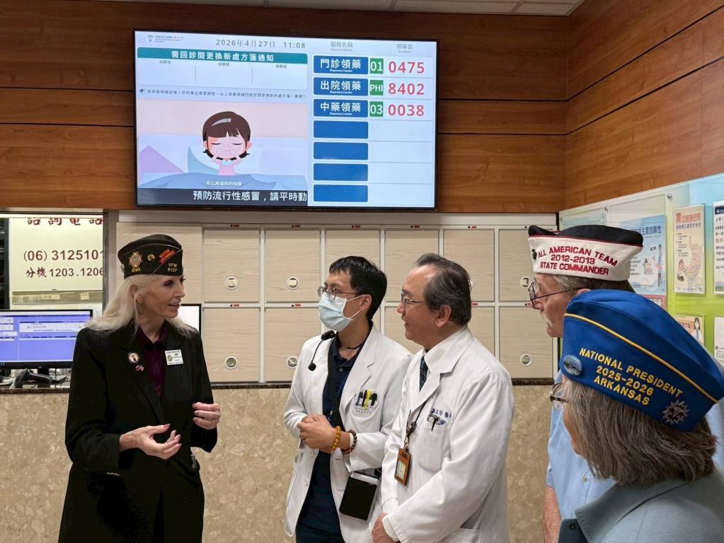 【大成報記者于郁金/臺南報導】美國海外作戰退伍軍人協會(Veterans of Foreign Wars,VFW)總會長魏眸娥偕同婦女會總會長伉儷及隨行代表團,應國軍退除役官兵輔導委員會(以下簡稱輔導會)邀請,於4月27日(一)上午蒞臨高雄榮民總醫院臺南分院進行參訪交流;本次訪台為期7天6夜,行程涵蓋職訓中心、臺北榮民總醫院、美國在台協會(AIT)及中正紀念堂等重要單位,充分展現台美兩國退伍軍人事務領域深厚連結。