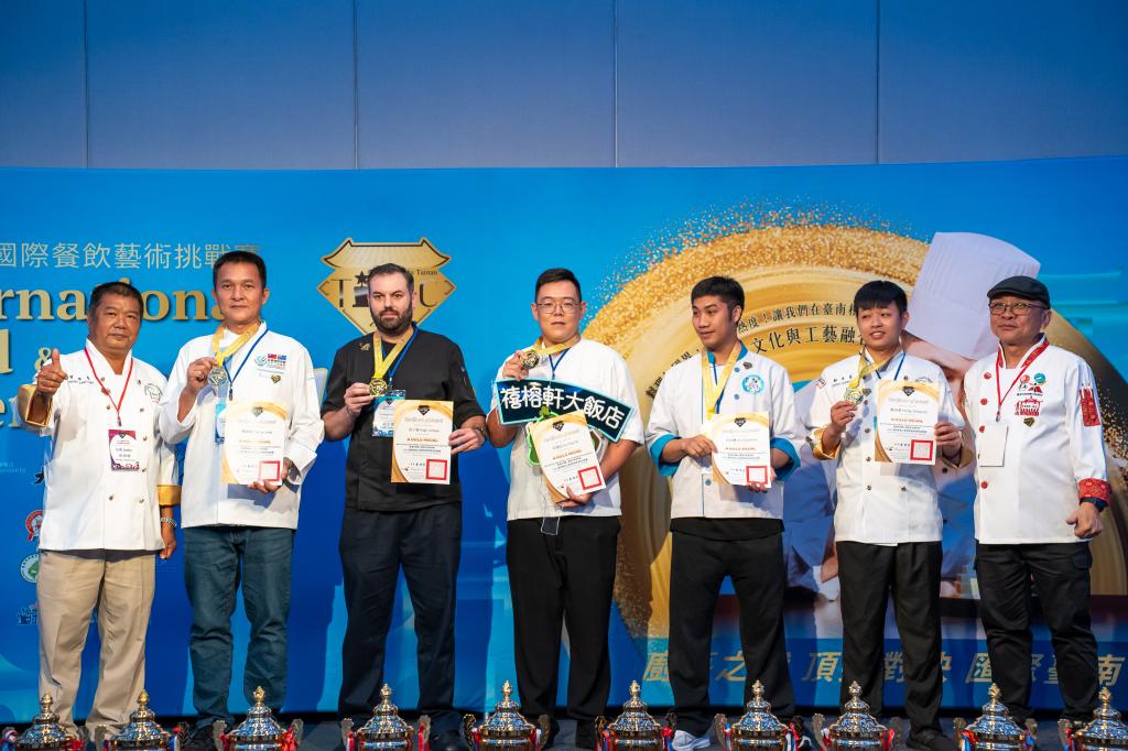 榕廷百匯餐廳主廚-鍾岱錡,以「武廟紅影・沙拉米火腿慕斯」、「億載潮光・潟韻牡蠣塔塔襯青蔬蜜凍與花生豆香」、「鹽光醃香雞胸佐帕瑪火腿襯芥末雞汁與赤地薯糕」3道料理獲得「靜態冷展類:手指小食靜態展示組」特金獎,3道精緻小食以臺南特色景緻作為發想,分別展現出府城風土溫度、山海柔光與獨有氣韻,堪稱在地人文地景結合與廚藝創意發想完美結合。