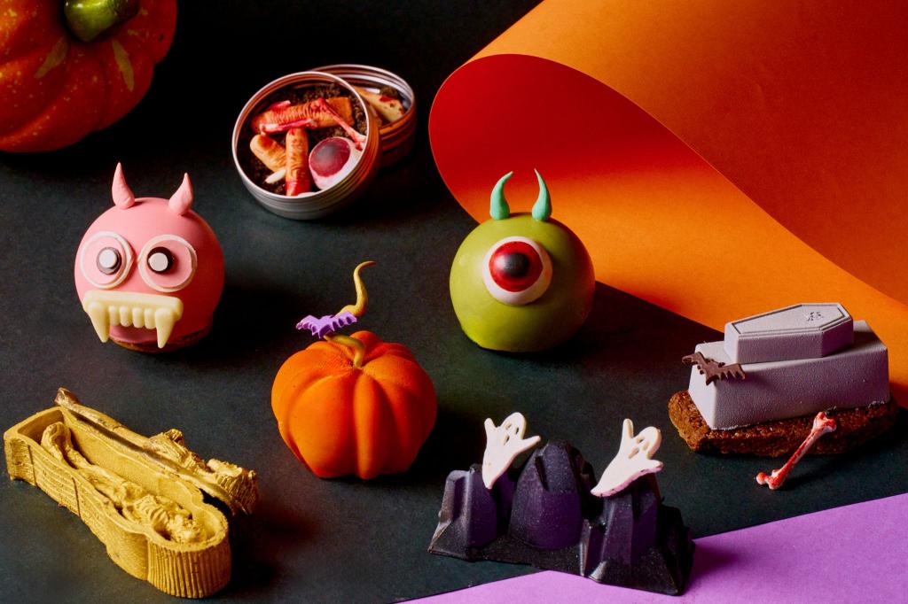 今年點心房主廚廖楷平以衝突張力與藝術美感打造萬聖節系列甜點,八吋「骷髏詛咒」是用白巧克力塑造逼真頭骨,血紅色巧克力象徵詛咒靈魂,內層以鬆軟海綿蛋糕搭配酸甜草莓凍與果泥,紅白配色驚悚又吸睛;七吋「幽冥夜遊」靈感來自於幽靈遊樂場,透過顏色與糖飾妝點交織出靈異畫面,蛋糕內餡是綜合莓果凍與鳳梨果泥,細膩雕塑讓人不忍下刀;最後是六吋「惡靈之書」,以沙哈巧克力蛋糕為基底,融合榛果及巴納脆片,巧克力慕斯與鮮奶油苦甜層次交錯,濃香誘人;上述整模蛋糕每顆1,280元起,外型與口味兼具為節慶增添詭譎甜意。