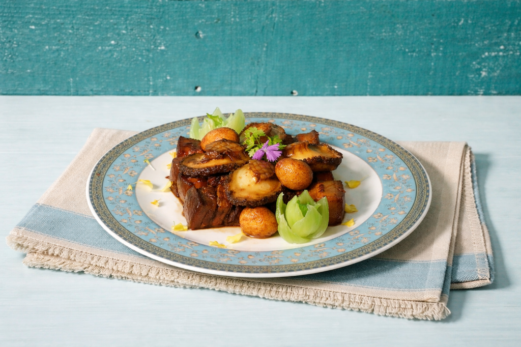 「冰花梅醬佛手瓜」保留佛手瓜天然脆度,搭配酸甜平衡的梅醬,口感清新、層次俐落;「蜜汁燻魚卷」運用宴席常見的手路菜作法呈現,魚肉經油炸定型後浸入蜜汁回潤,外酥內嫩、甜香溫和,讓人一口接一口;「鮑魚外婆紅燒肉」經典紅燒技法慢燉五花肉,加入鮑魚一同煨煮,使海味與醬香層層交織,膠質豐富卻不顯油膩;「撈汁鮮白蝦」則以潮菜酸香提鮮手法,凸顯白蝦鮮甜彈性,留下清爽收尾。