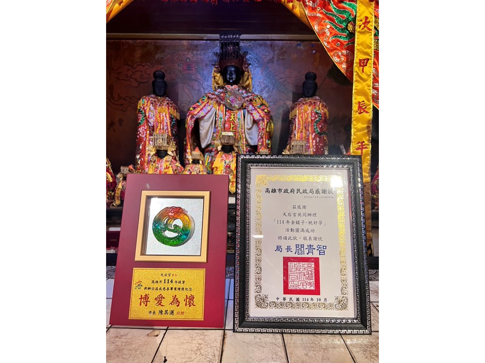 這份長期的堅持與奉獻,使旗山天后宮於高雄市政府民政局舉辦的「114年績優宗教團體表揚大會」中脫穎而出,榮獲「興辦公益或慈善事業績優獎」。典禮上,由高雄市政府郭添貴秘書長代表陳其邁市長親自頒發獎項,表達對天后宮長年奉獻公益、安定社會的感謝與肯定。