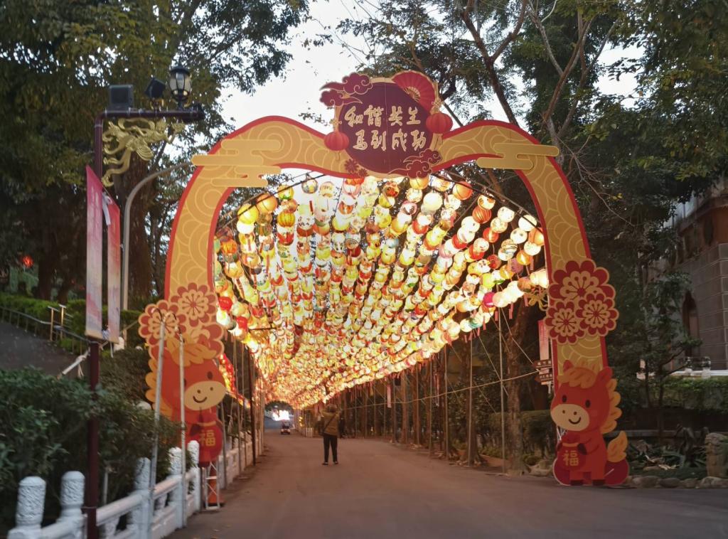 主燈「蓮華飛騎」高達12米,架設於曼陀羅園,象徵好事連連、馬到成功。燈座環繞6面LED螢幕,設計互動接福袋遊戲,亮燈時間為農曆初一至初六,每晚7時及9時各一場,飛馬展演時間3分鐘。