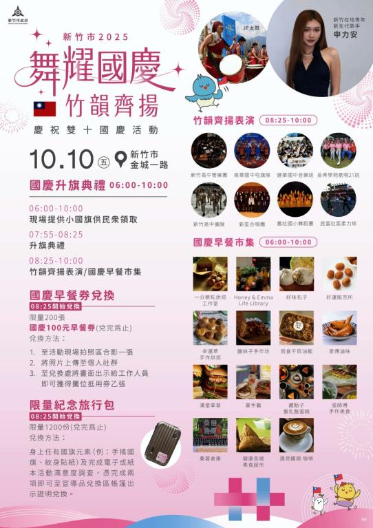 竹市府社會處說明,市民朋友只要配戴具有國旗元素的物件並協助填寫活動問卷,即可獲得紀念旅行包乙個,限量1,200個,送完為止;現場同時設有拍照打卡區,於指定時間內上傳至社群平台,就有機會兌換限量200張、每張面額100元的早餐兌換券,數量有限,送完為止。活動現場亦規劃15攤早餐市集,並結合環保餐具租借制度,推廣綠色生活理念,另設置休息區,讓市民在愉快氛圍中共享國慶喜悅。社會處提醒,為維護交通秩序,建議市民多加利用大眾運輸工具,或提早抵達,以避免人潮壅塞。