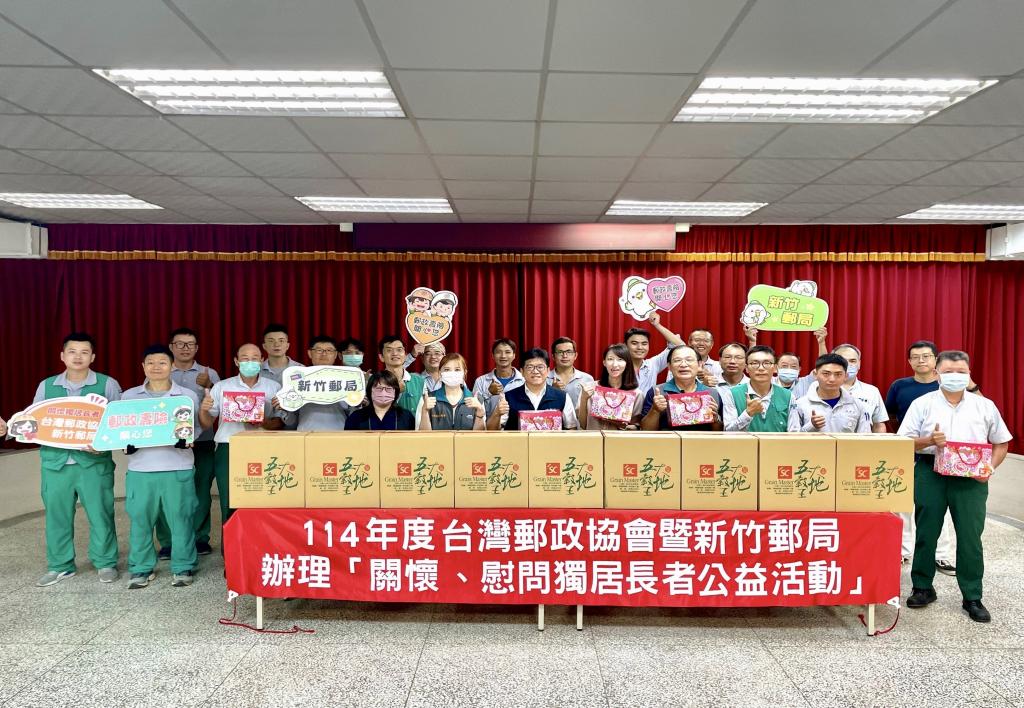 ▲新竹郵局由局長吳進益(中)帶領辦理「秋節郵愛關懷獨居長者公益活動」。(圖/新竹郵局提供)