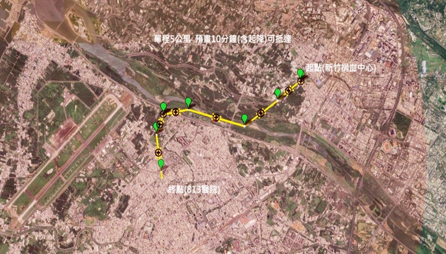 近年,隨著科技的迅速發展,無人機技術的應用範疇日益廣泛,在醫療領域,潛力更是備受矚目,特別是在緊急醫療送血方面。此次,經評估後,我們將從「新竹捐血中心愛心樓」出發起飛,選定「國軍桃園總醫院新竹分院」進行無人機緊急送血計畫,路線單程約5公里,飛行時間預估10分鐘。飛行路線主要落於頭前溪橋上方,透過無人機的技術,快速、安全的將血液運送到需要的地方,希望大幅提升緊急醫療救援的效率。
