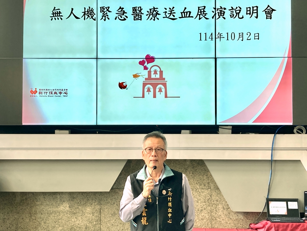 ▲新竹捐血中心舉辦「無人機緊急醫療送血展演」,新竹捐血中心主任王雲龍致詞揭幕。