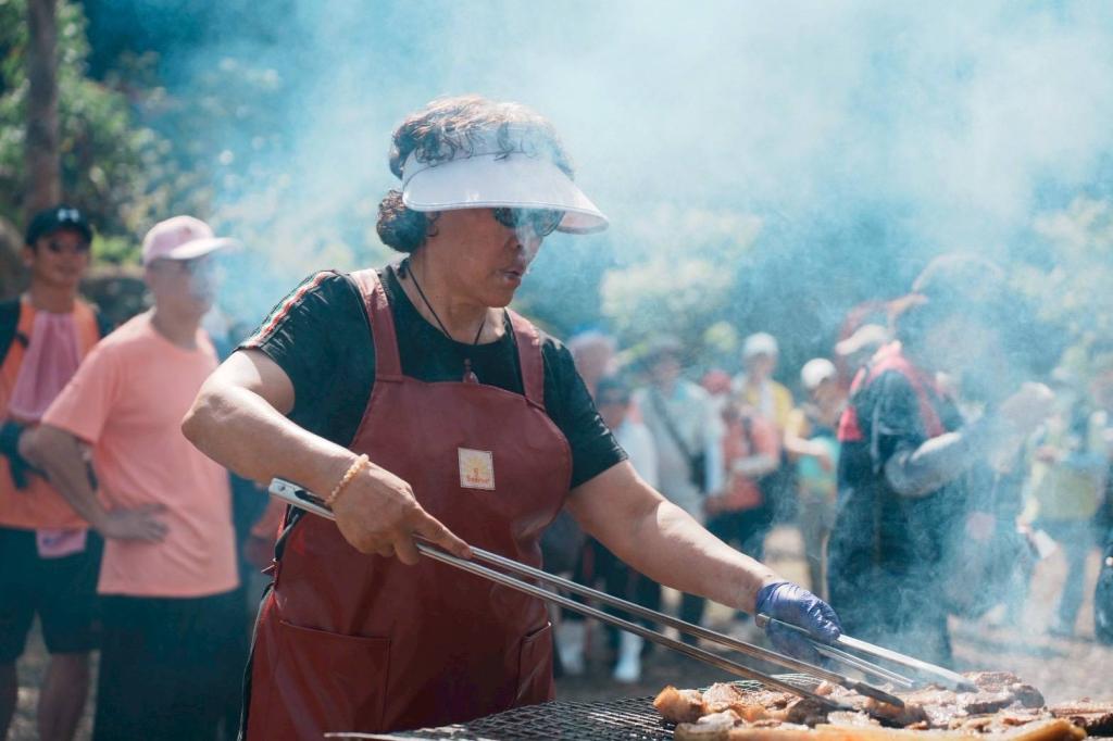 ▲苗栗南庄部落健行500位旅人齊步探索石壁部落,折返點享受香氣四溢的原民烤豬肉。(圖/參山處提供)