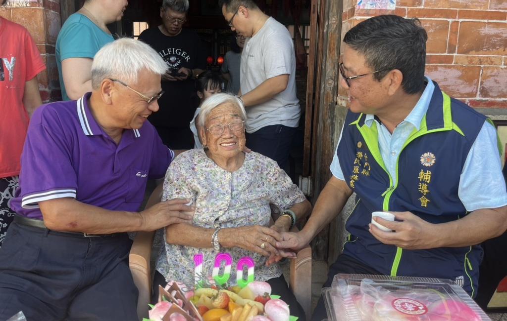 【大成報記者陳金/金門報導】金門縣榮民服務處劉信義處長11日率領總幹事李全順、業務承辦汪成飛輔導員、榮欣志工許丕懌助理員及榮欣志工等一行,前往金沙鎮沙美楊奶奶家中歡慶百歲壽誕,除轉贈總統及行政院長祝賀壽屏,並代表輔導會主任委員嚴德發致贈「金壽桃」,獻上對壽星最深祝福;活動邀請金沙鎮吳有家鎮長、汶沙里張瀚龍里長共襄盛舉,現場熱鬧喜悅,所有貴賓隨後在劉處長帶領下高唱生日歌、切蛋糕、送壽桃,一起分享百歲人瑞福氣,活動過程溫馨圓滿。