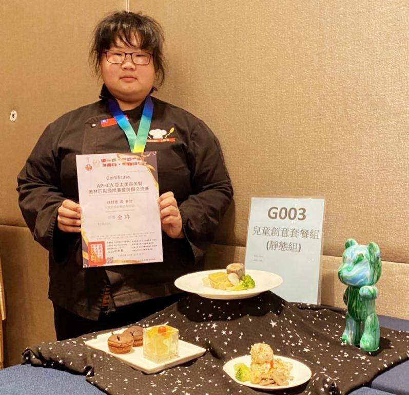 敏實科技大學餐飲管理系餐二A學生曾毓嵂參加無國界料理廚藝展示—前菜展示組,以獨到的創意與細膩的烹飪技巧榮獲金牌;敏實科技大學餐飲管理系餐三A學生徐翊恩則在兒童創意套餐組中,以充滿童趣又兼具美味的套餐設計,摘下金牌,展現出色的創意與實力。